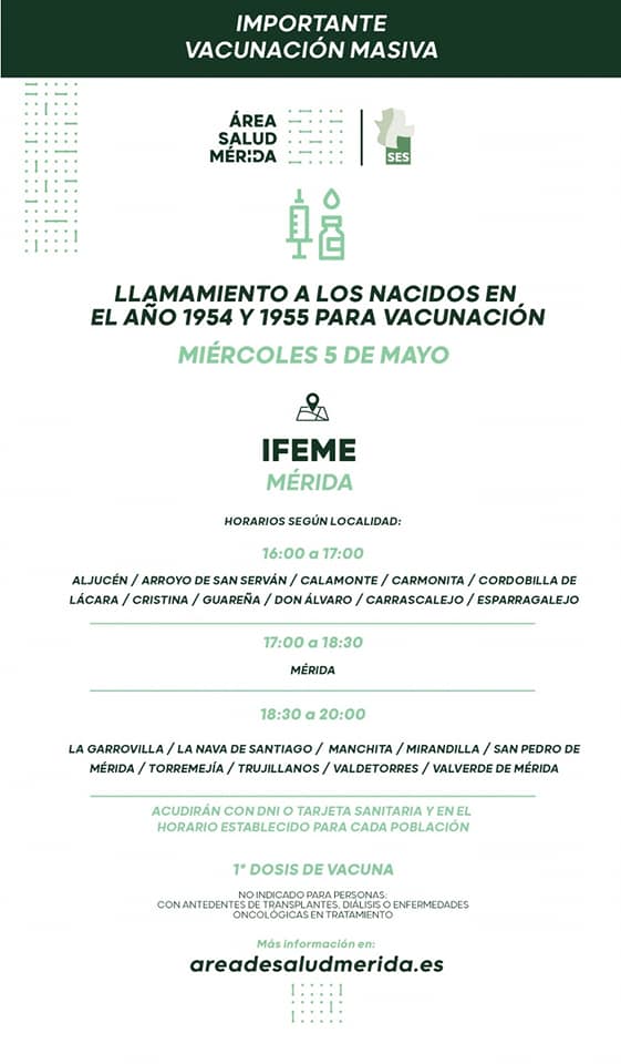 En la tarde de este miércoles están llamados a vacunarse sin cita previa los nacidos en 1054 y 1955 en IFEME Mérida. Estos son los horarios: