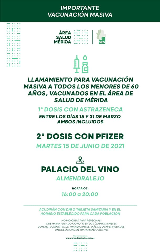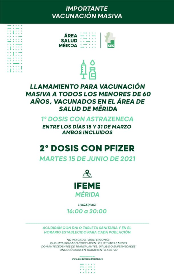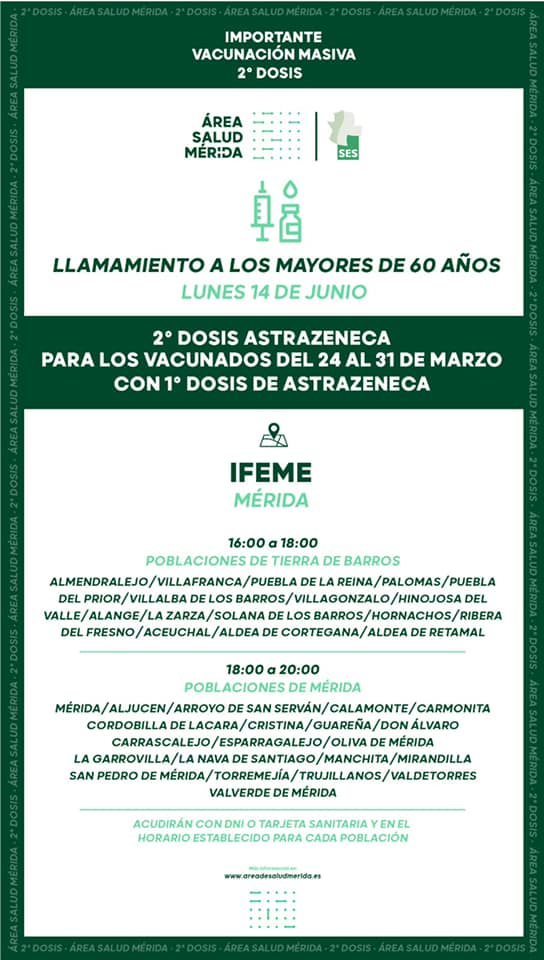 El Área de Salud de Mérida ha hecho un llamamiento este domingo para realizar una vacunación masiva este lunes, 14 de junio, a los mayores de 60 años que recibieron la primera dosis de AstraZeneca entre el 24 y el 31 de marzo.